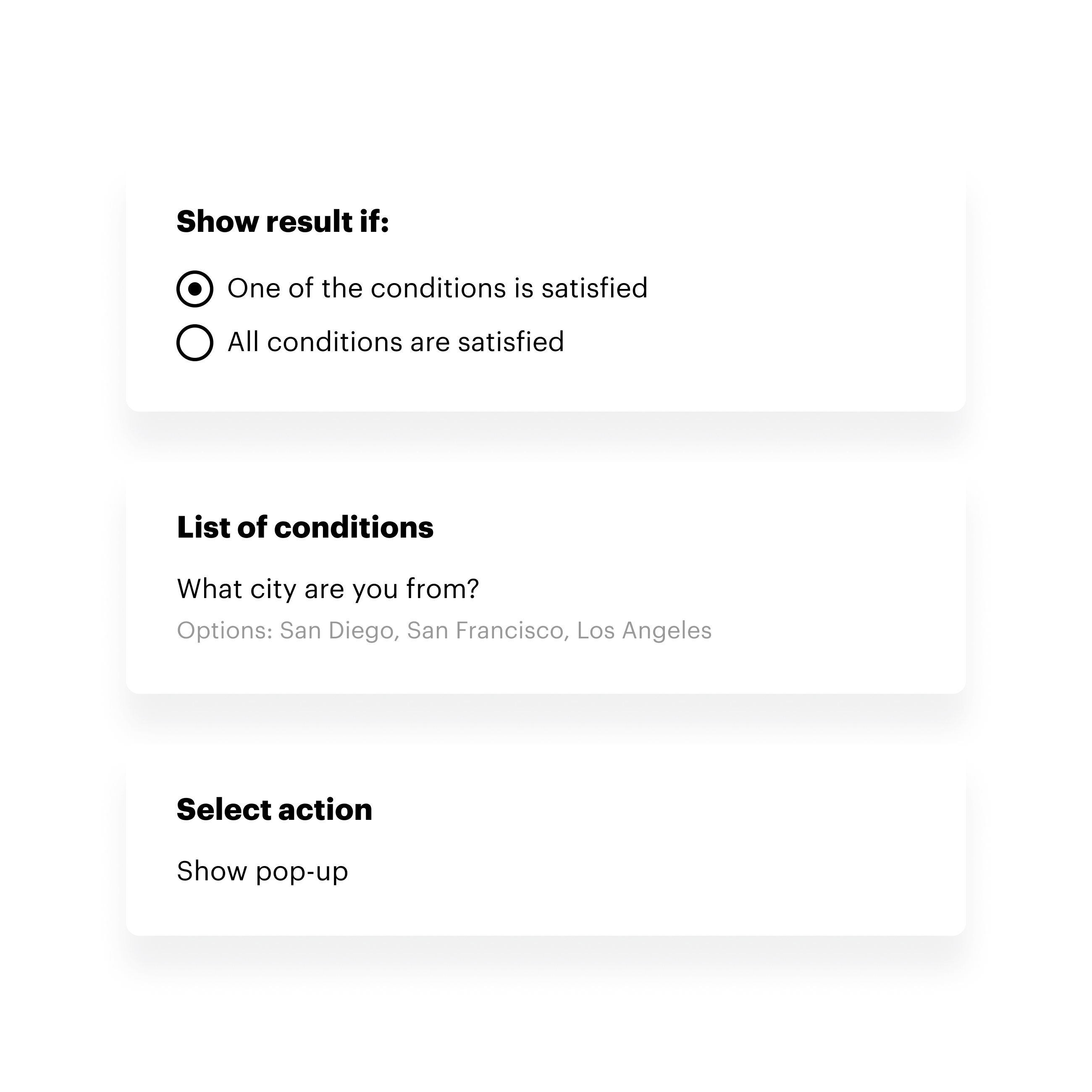 Personaliseer quizzen voor elke bezoeker: stel vragen op basis van de gegeven antwoorden. Bezoekers hoeven geen irrelevante vragen te beantwoorden en jij krijgt meer gedetailleerde informatie.