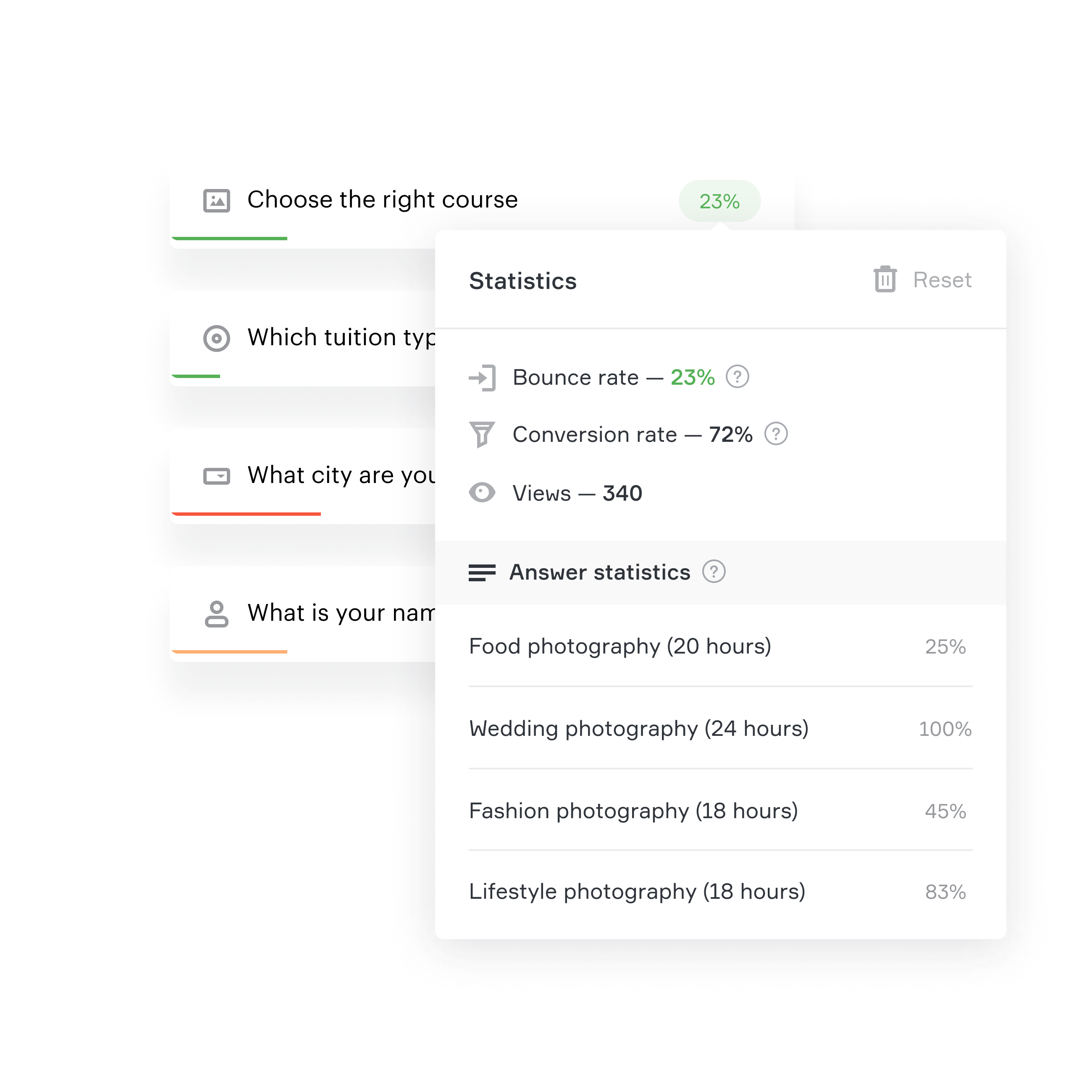 Je kunt de bounce rate voor elke vraag bekijken en het percentage van de keuze voor alle antwoordopties. Dit helpt bij het identificeren van vragen die de hoogste bounce rate veroorzaken.